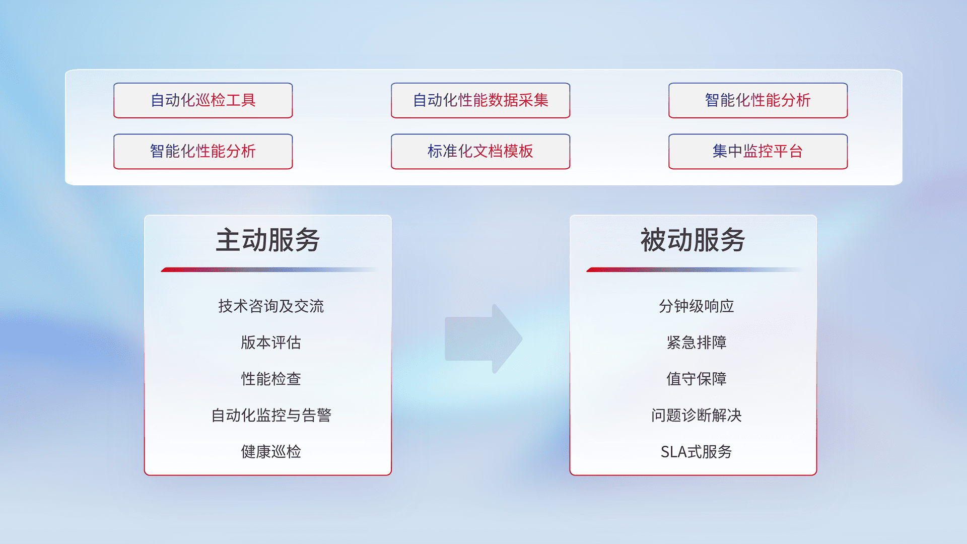 智能化工具和标准化文档,,保障服务质量,,提供主动服务(包含技术咨询、、、、版本评估、、、、性能检查、、、自动化监控与告警、、、、健康巡检)和被动服务包含(分钟级响应、、、紧急排障、、、值守保障、、、、问题诊断解决、、、SLA服务)。。。